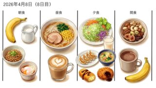 第2週 2026年4月8日の食事記録|AIによる栄養指導 2026年4月8日(8日目)の食事記録|AIに栄養分析してもらったら、総合評価66点でした。食事内容の分析と栄養指導を生成AIにまかせる企画おだしゅん本日は8日目です。8日目の食事内容8日目日は、朝食・昼食・夕食を食べ、間食の回数は2回でし... 2026.04.12 第2週