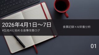 1週間のまとめ 2026年度第一週の食事傾向|AIによる栄養分析 2026年第一週(4月1~7日)の食事記録を生成AIに栄養分析させ、上手くいったこと・出来なかったことをまとめました。是非ご覧ください! 2026.04.10 1週間のまとめ第1週