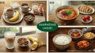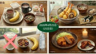 第4週 2026年4月25日の食事&運動記録|AIによる栄養指導 2026年4月25日の食事記録を生成AIに栄養分析させたら、ちょっと食べ過ぎたけど総合評価は73点でした。是非ご覧ください! 2026.04.25 第4週
